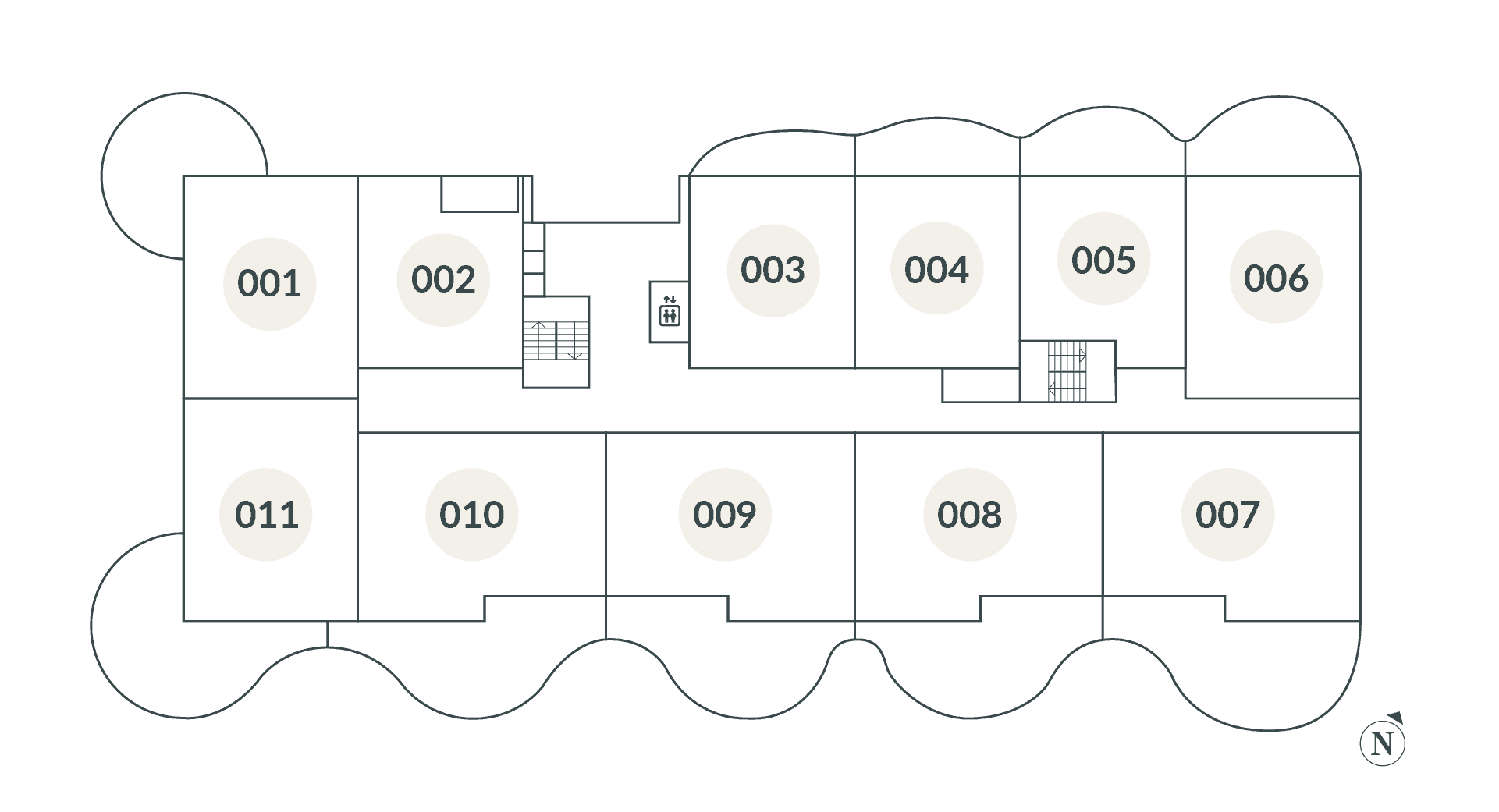 Begane grond: 001, 006, 007, 008, 009, 010, 011, 012, 014, 015, 016, 017
